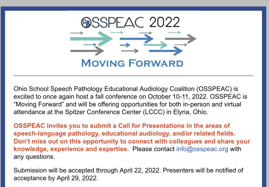OSSPEAC is proud to announce that we will be having an in-person conference this year! There will be opportunities for both in-person and virtual attendance. The conference will be at the Spitzer Conference Center In Elyria, Ohio. We are looking for presenters in the areas of speech-language pathology, educational audiology, and related fields. Please click the following link below to apply!